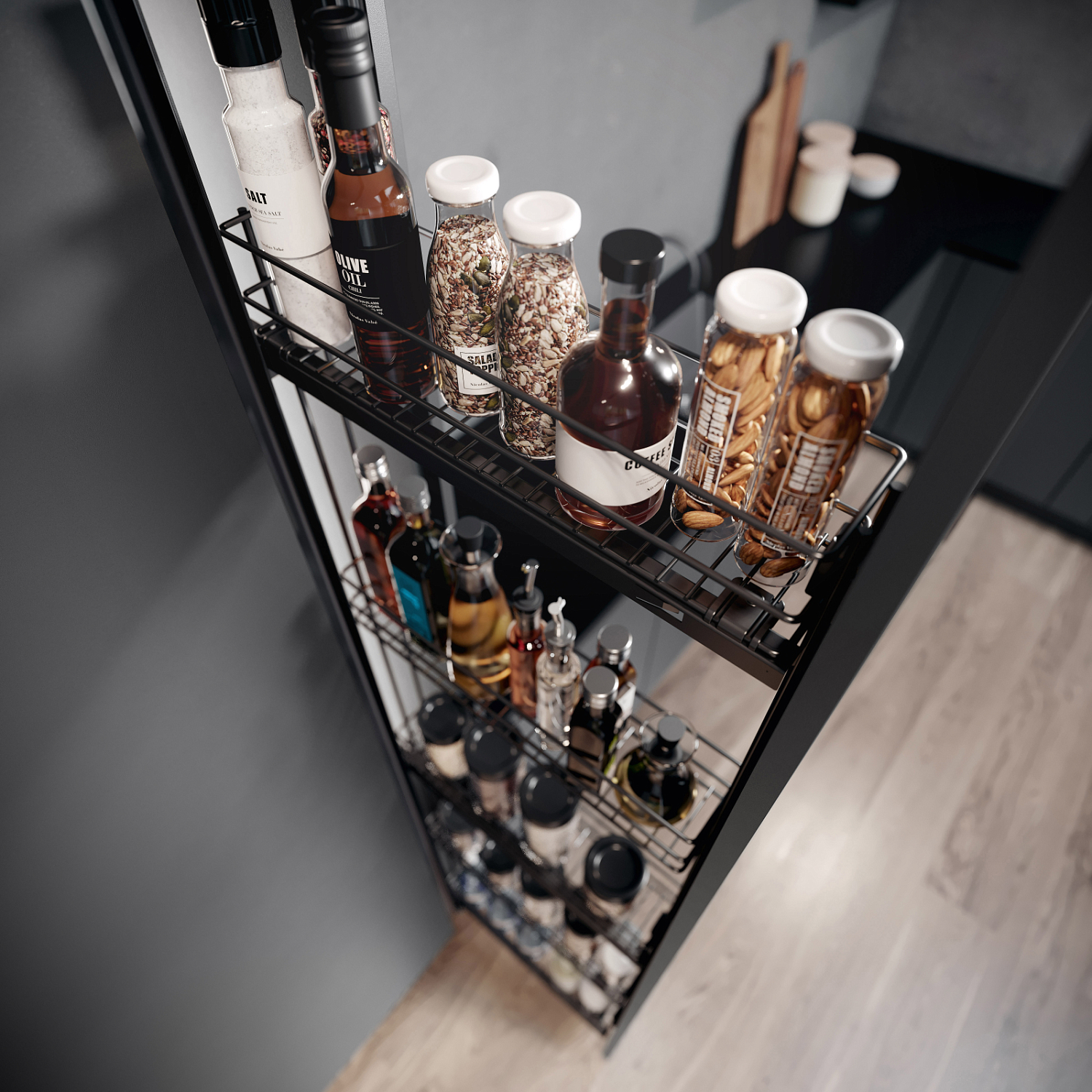 Выдвижная бутылочница TAL Rack15 подходит для хранения запасов в высоких и узких шкафах. Система крепится к фасаду и правой боковине корпуса. Корзины несъемные. Максимальная нагрузка на корзину – 5 кг.