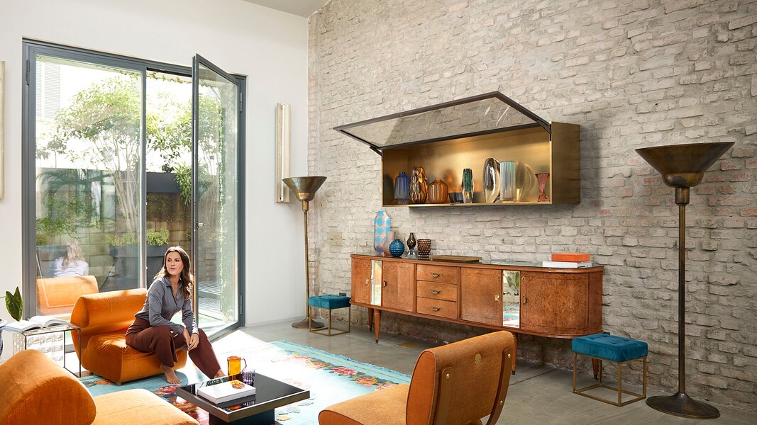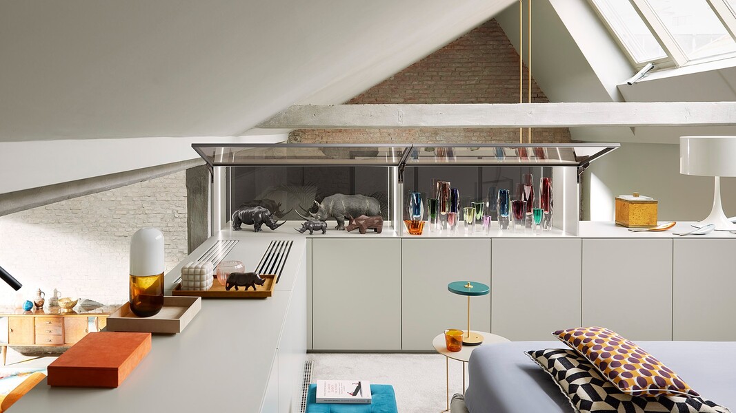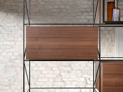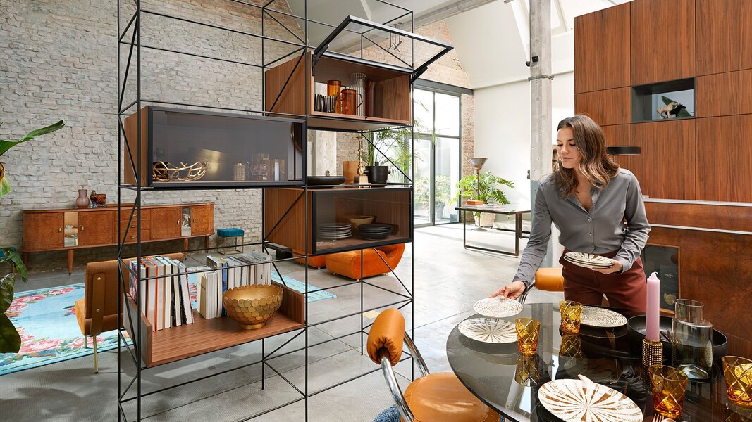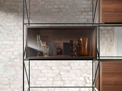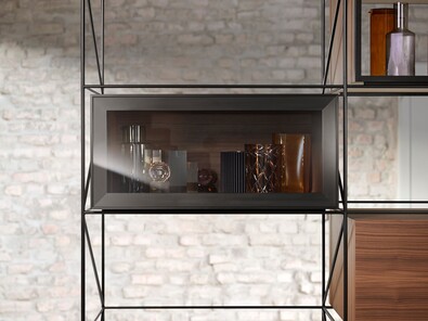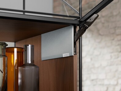 Механизм интегрированного подъемника скрыт в боковине корпуса, но его функции можно ощутить в любое время: регулировка силового механизма осуществляется спереди, встроенный ограничитель угла открывания, а также возможность остановки фасада в любом положении. Это обеспечивает полную свободу движений и идеальный доступ к содержимому шкафа.