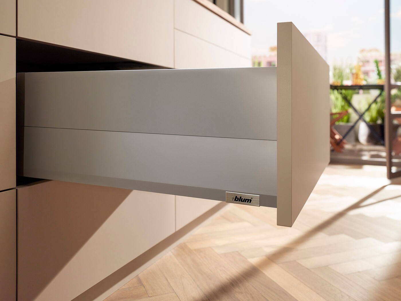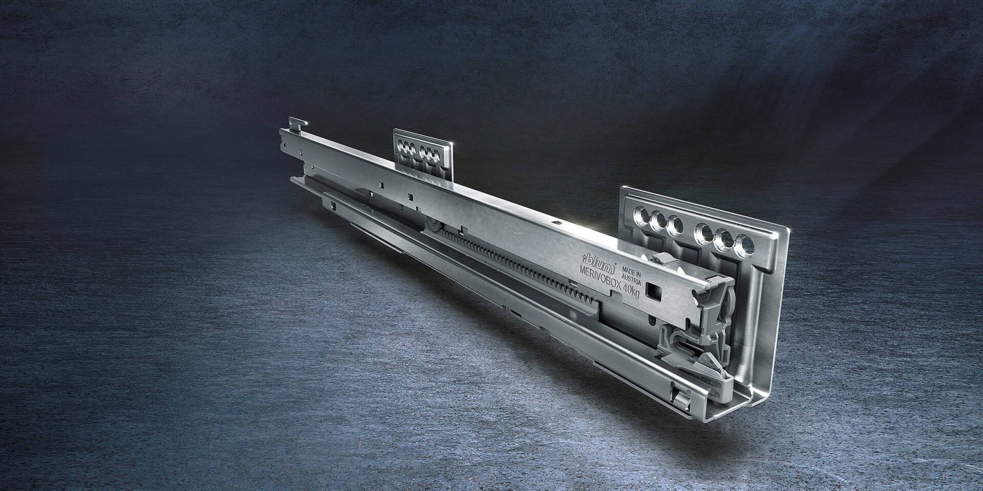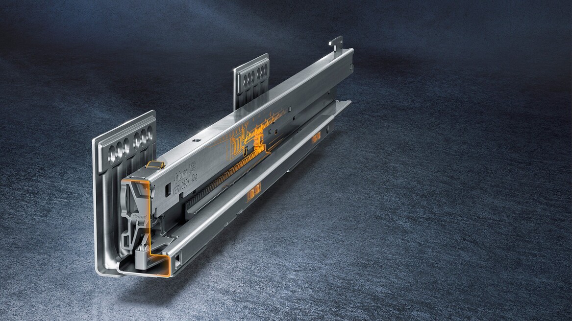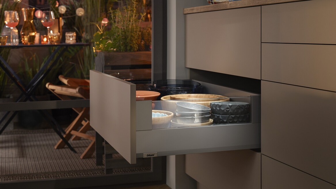 Инновационная L-образная форма направляющих обеспечивает ящикам MERIVOBOX исключительную стабильность – даже при высокой нагрузке они впечатляют своим движением. Наряду с синхронизированным плавным ходом высокая стабильность фасада предоставляет новые возможности для дизайна кухонной мебели – Вы можете без проблем сочетать высокие фасады с низкими царгами.
