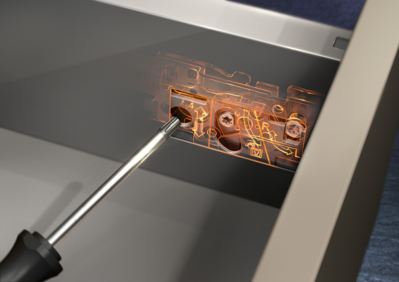 Последовательная концепция платформы позволяет легко и быстро реализовать любой вариант ящика MERIVOBOX. Система выдвижения обладает простой, понятной и удобной трехмерной регулировкой, которая одинакова при использовании всех видов царг.